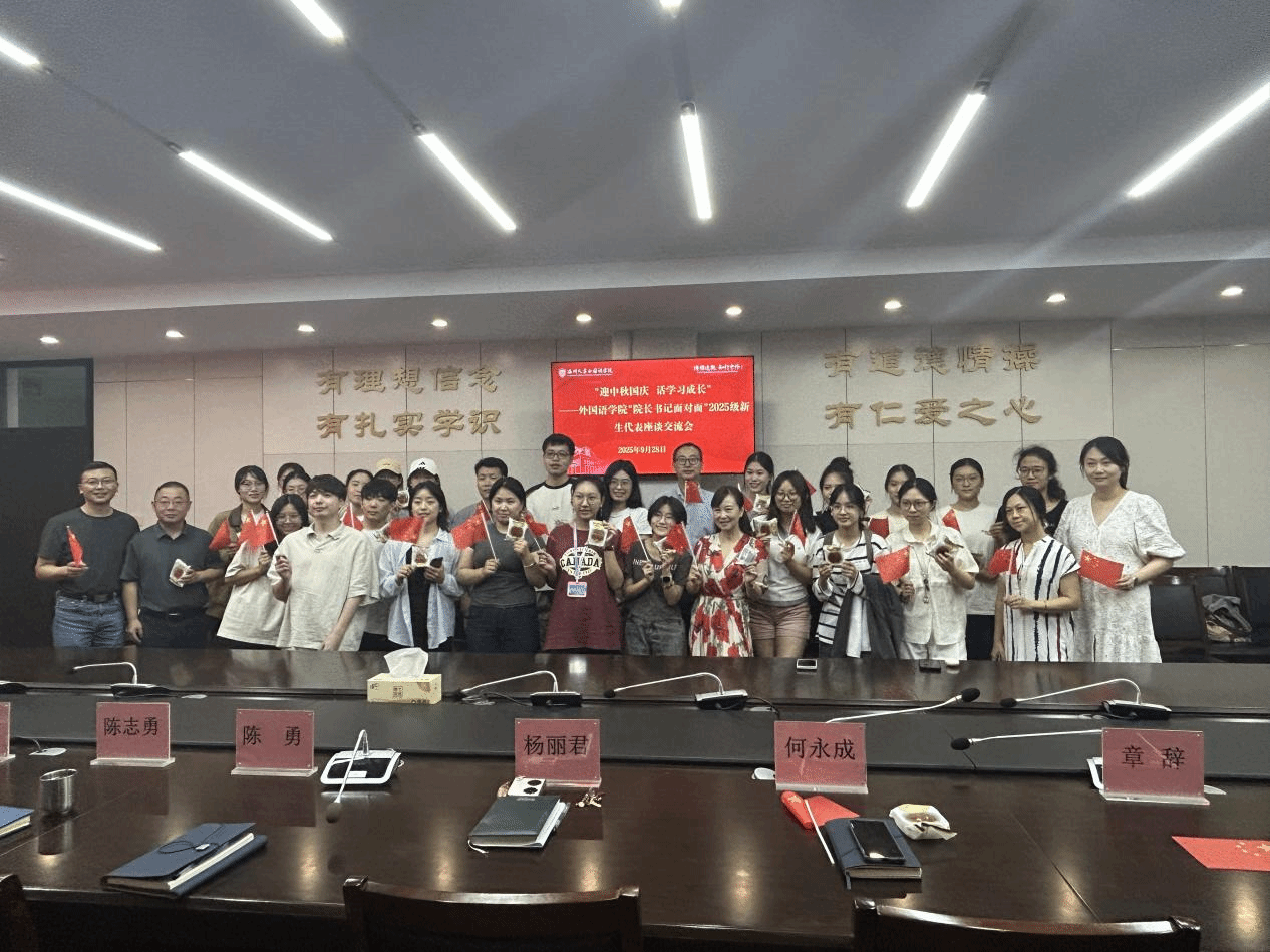 活动在全场师生合唱《歌唱祖国》的动人旋律中达到高潮。真挚的歌声承载着对祖国76华诞的祝福,也凝聚着外院人携手共进的力量。这场中秋国庆前夕的座谈会,不仅是一次入学指导,更是一次心灵的温暖碰撞,让初离家门的学子感受到公司的深情关怀,为2025级新同学的大学之旅注入了温暖与力量。