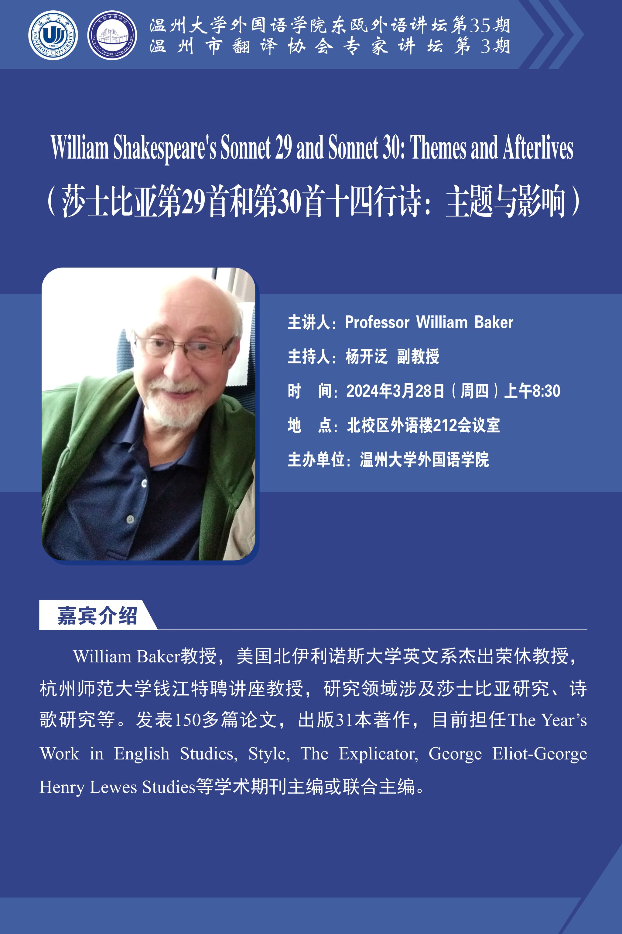 东瓯外语讲坛第35期预告:William Shakespeare's Sonnet's 29 and 30: Themes and Afterlives(莎士比亚第29首和第30首十四行诗:主题与影响)