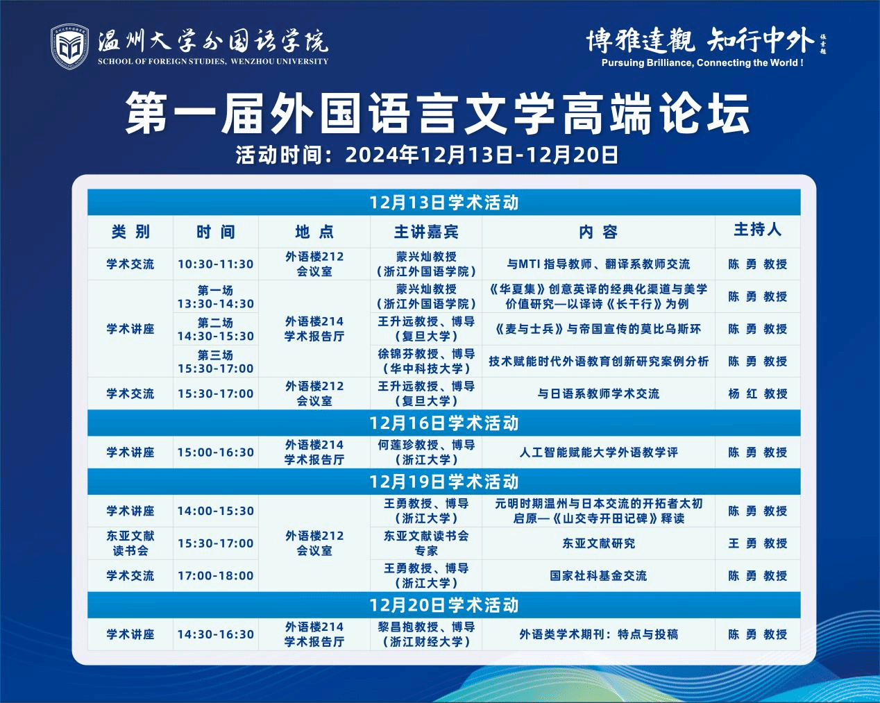 2024年12月13日至20日,永利65335com成功举办了第一届外国语言文学高端论坛。本次论坛邀请了多名国内著名学者莅临现场为公司师生指导、交流。论坛共举办6场学术讲座、3场专业性学术交流以及1场东亚文献读书会,可谓是一场形式多样、亮点颇多的学术盛宴。