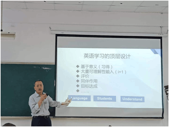 王崴然老师首先从如何学习英语这个话题导入,陈述了当前英语教学存在的问题,并结合克拉申的二语习得理论,提出语言是一项技能,需要在可理解的前提下大量的输入,并不断接受训练才能习得(而不是学得)。接着王老师讲解了整体语言教学法,并由此引入单元整体教学的具体实施策略,提出了要以员工为中心,课程结束需要评估等宝贵的教学经验。最后,李宋昊老师和19级研究生代表李雨诗对讲座进行了总结和心得探讨。
