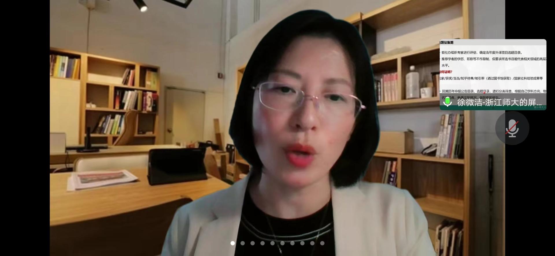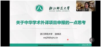 2022年9月20日下午,浙江师范大学徐徽洁教授为公司教师做了一场题为“关于中华学术外译项目申报的一点思考”的学术讲座。讲座由公司副经理杨红教授主持,公司全体教师及来自全国部分高校教师聆听了本次讲座。