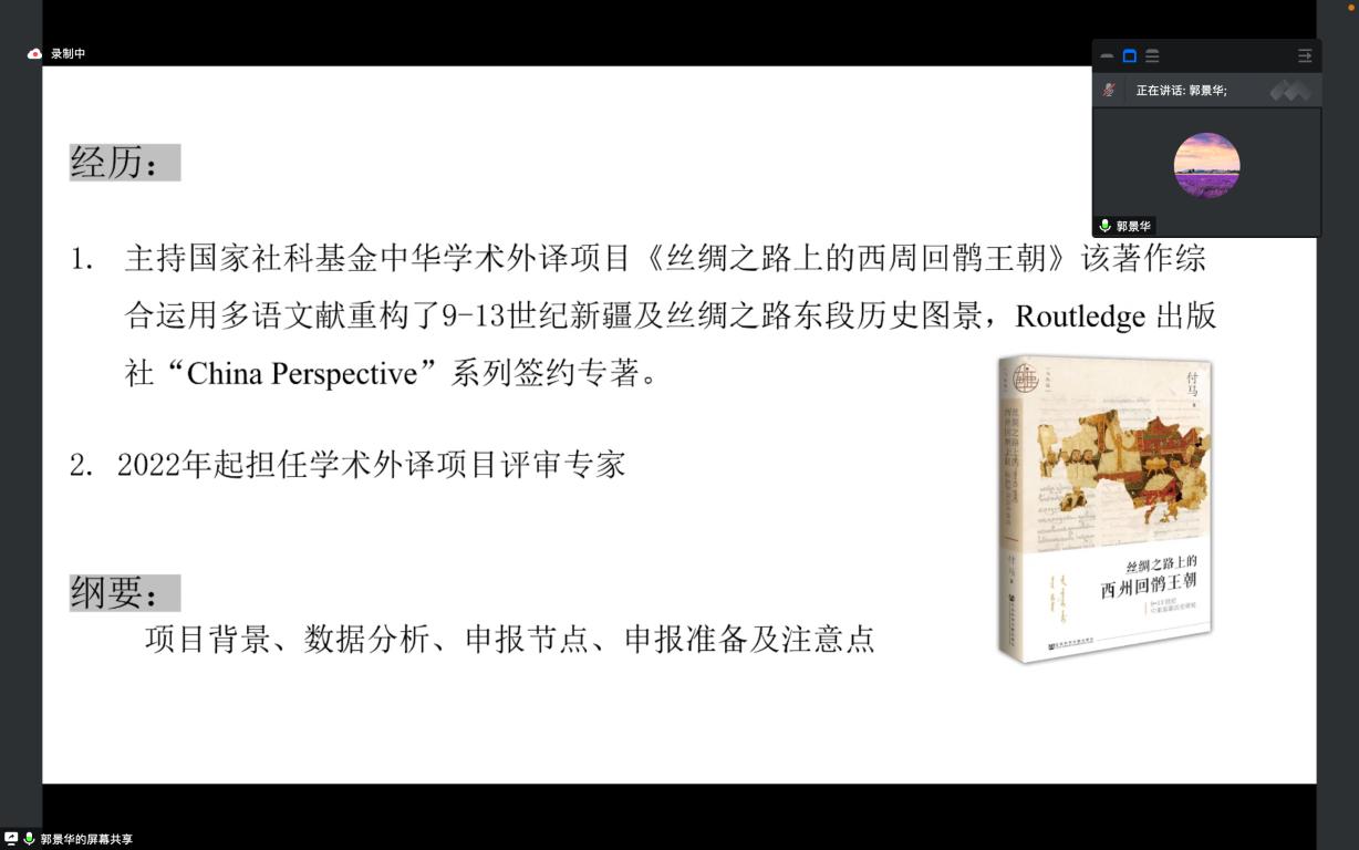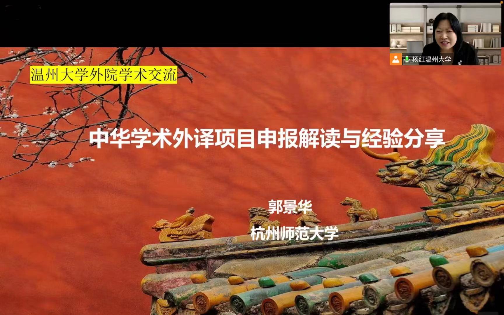 2022年9月30日下午,永利65335com邀请了杭州师范大学郭景华教授做了题为“中华学术外译项目申报解读与经验分享”的学术讲座。讲座由公司副经理杨红教授主持,公司全体教师参加了此次讲座。