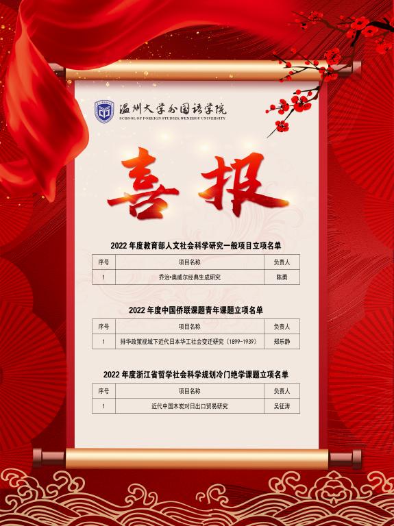 近日,2022年度教育部人文社会科学研究项目、中国侨联课题、浙江省哲学社会科学规划课题相继揭晓,永利65335com捷报频传,其中陈勇教授获教育部人文社会科学研究一般项目,郑乐静博士获中国侨联课题青年课题,吴征涛博士获浙江省哲学社会科学规划冷门绝学课题等。