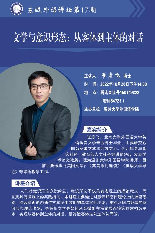 东瓯外语讲坛第17期预告:文学与意识形态——从客体到主体的对话