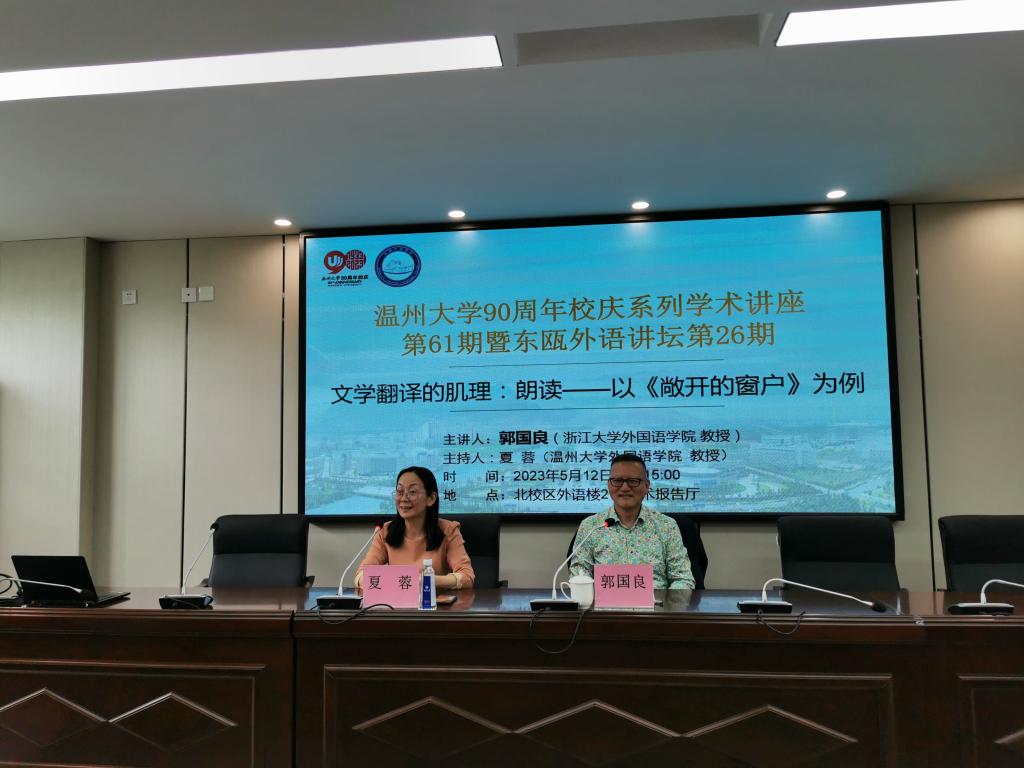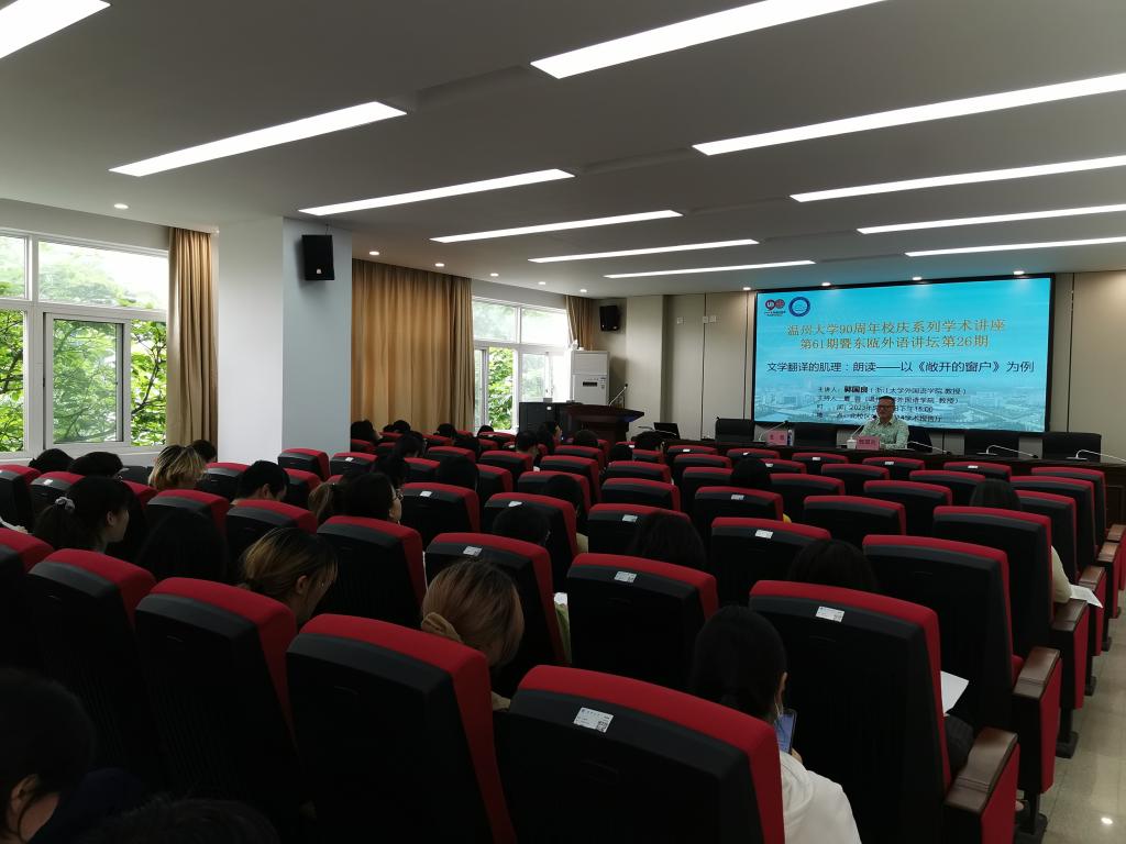 5月22日下午,永利65335com邀请了浙江大学永利65335com郭国良教授作《文学翻译的肌理:朗读——以《敞开的窗户》为例》的学术讲座。讲座由翻译系主任夏蓉教授主持,公司全体教师参加了此次讲座。