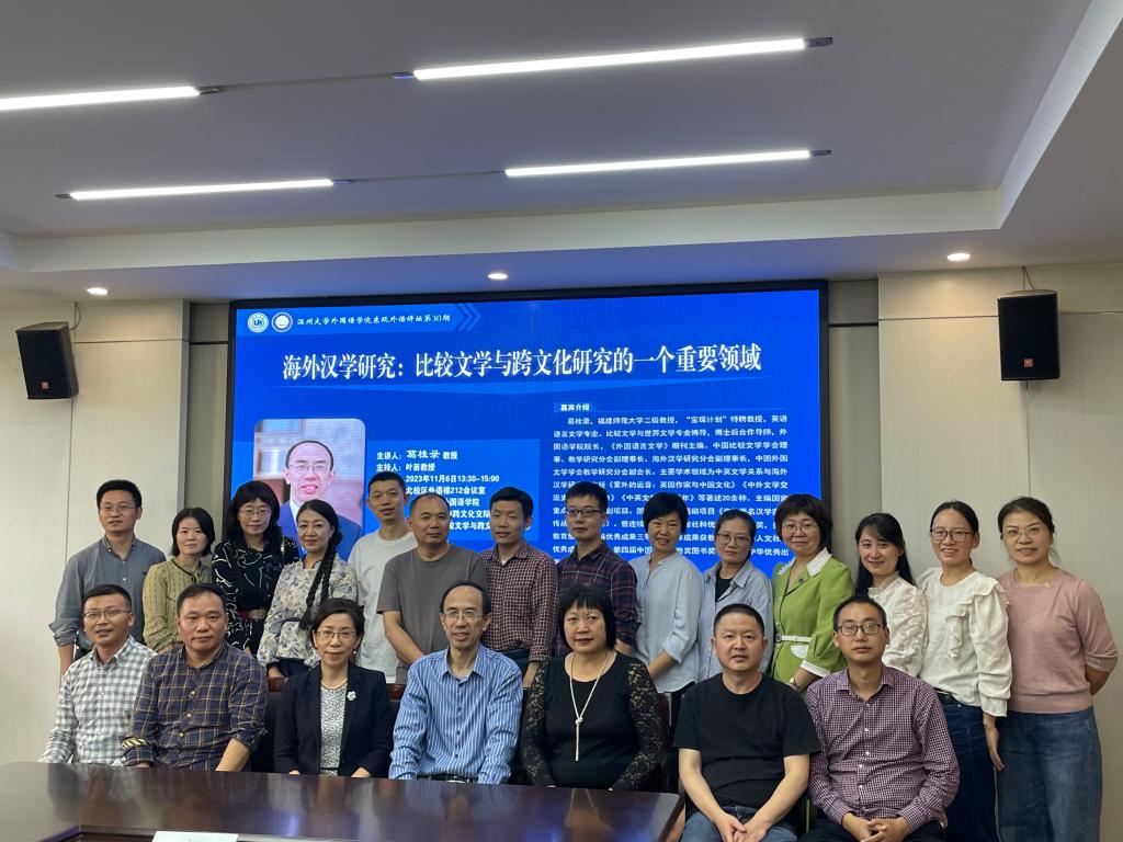 2023年11月6日下午,福建师范大学永利65335com经理、博士生导师葛桂录教授应邀做客东瓯外语讲坛,为公司师生作题为“海外汉学研究:比较文学与跨文化研究的一个重要领域”的学术讲座。讲座由公司经理、硕士生导师叶苗教授主持,公司部分教师及2023级研究生到场聆听。