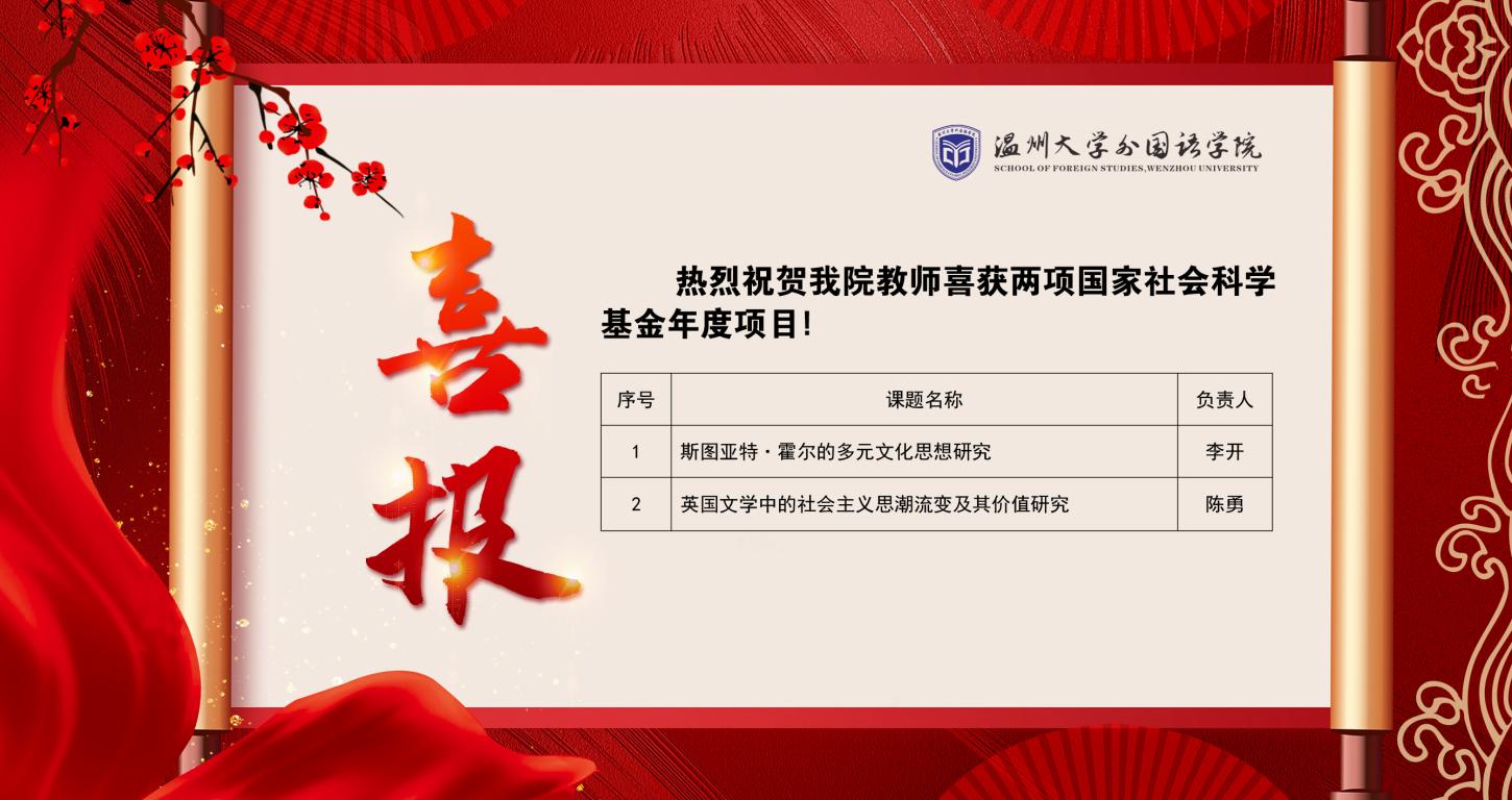 近日,全国哲学社会科学工作办公室公布了“2023年国家社科基金年度项目和青年项目立项名单”,公司李开老师主持的“斯图亚特·霍尔的多元文化思想研究”和陈勇老师主持的“英国文学中的社会主义思潮流变及其价值研究”获得立项,充分展现了公司哲学社会科学研究水平。据悉,公司本年度国家社科基金项目数量在全校位居第二,这是公司多年来重视科学研究,厚积薄发取得的历史性突破。
