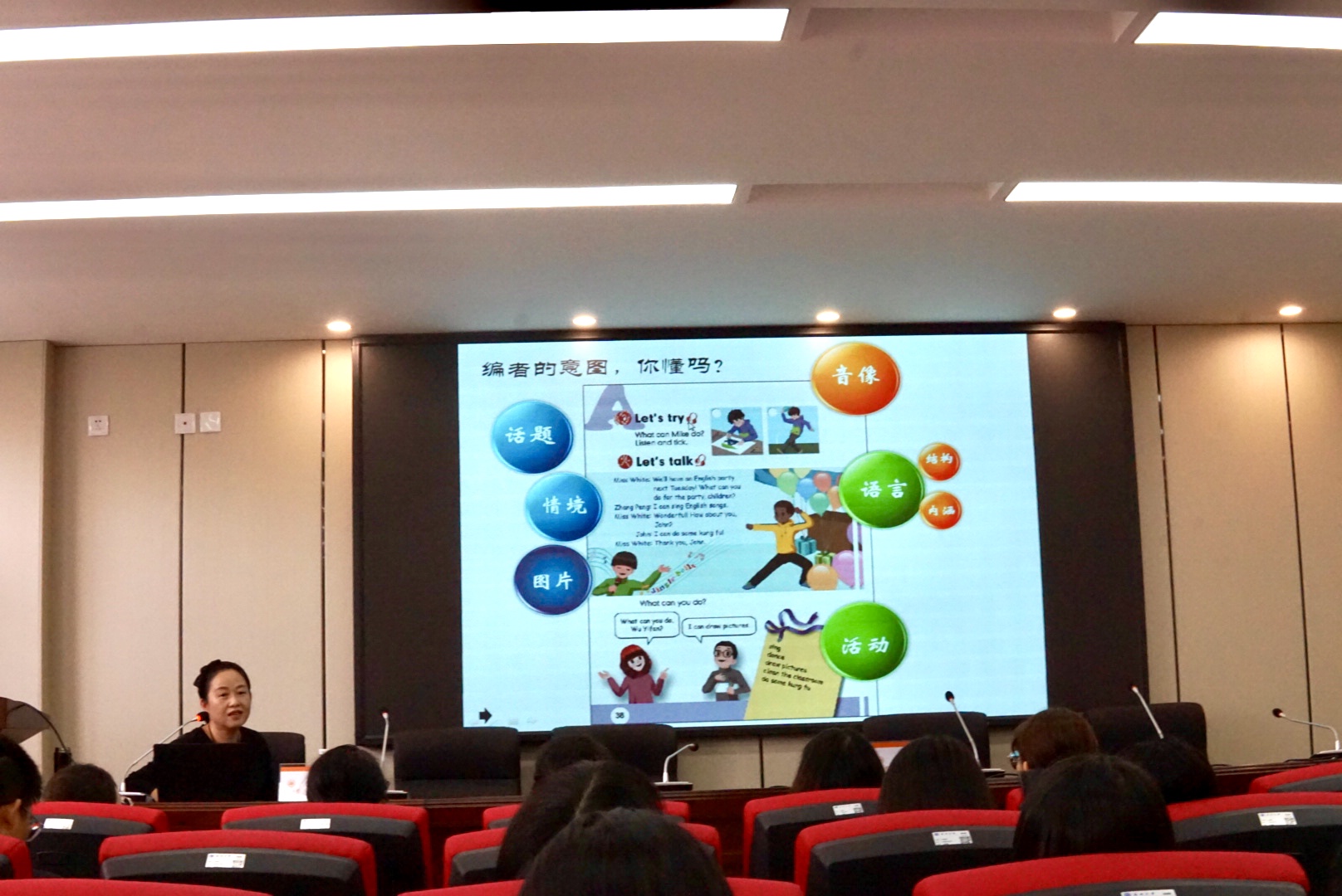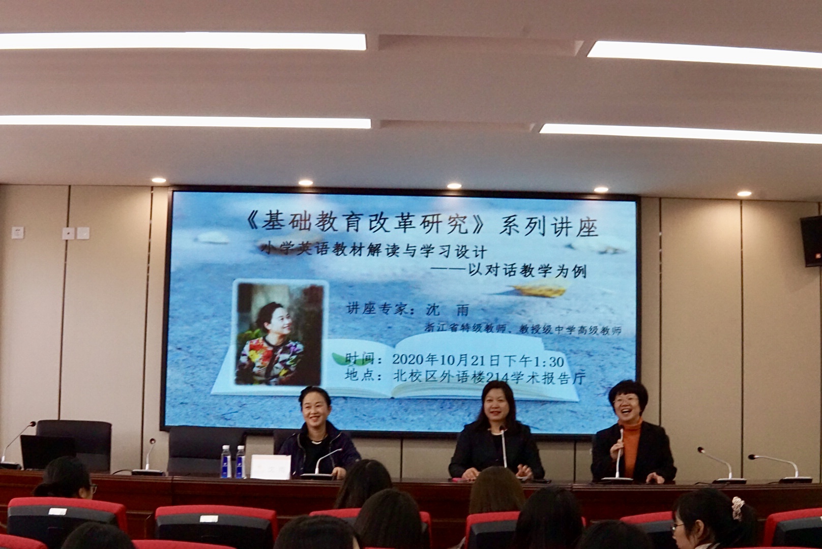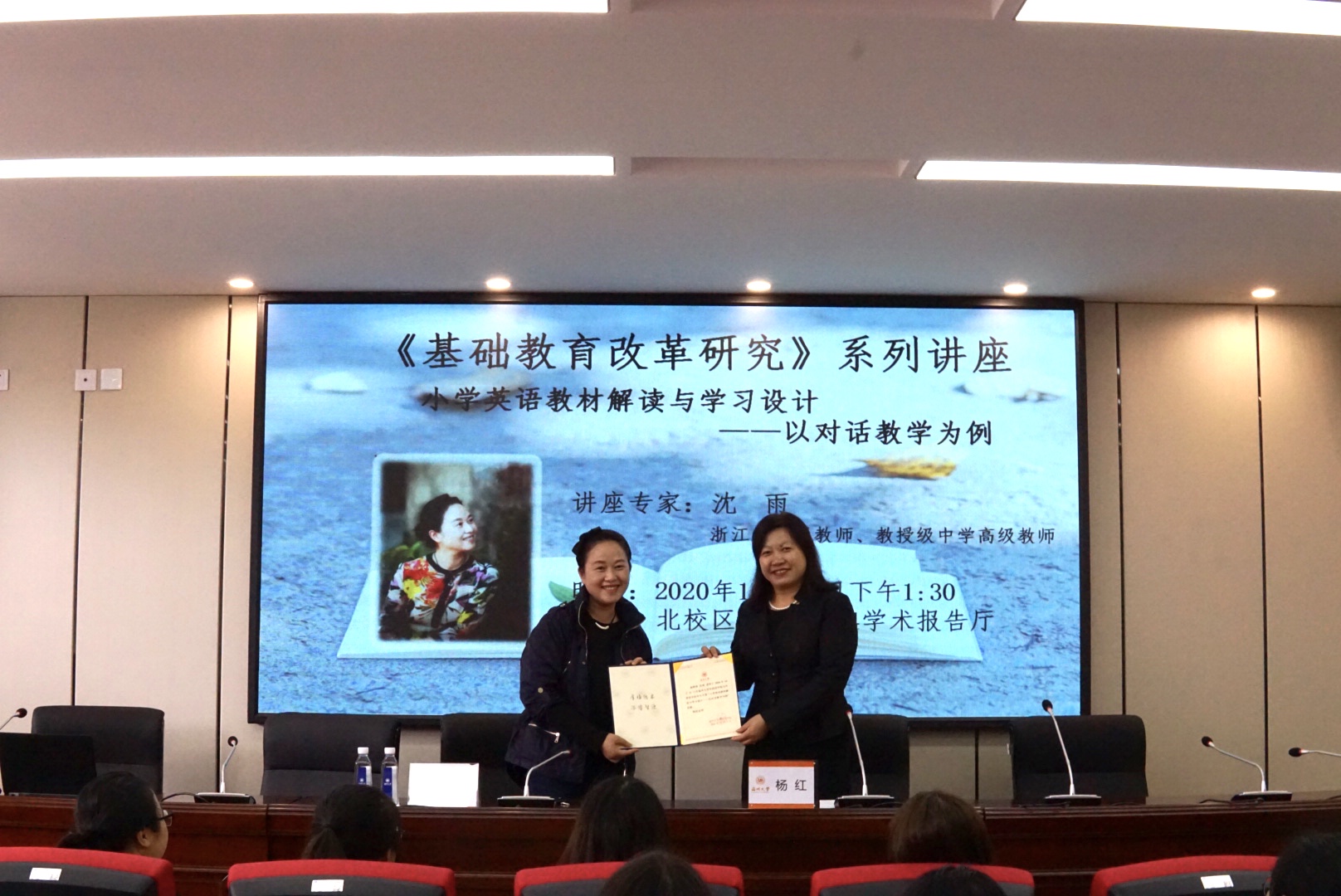10月21日下午,在外语楼214学术报告厅温州市公司产品研究院小学英语教研员沈雨老师开展了关于“小学英语教材解读与学习设计——以对话教学为例”的讲座。沈雨老师为浙江省特级教师、教授级中学高级教师,曾多次获得省教研课题成果一、二等奖。讲座开始前,杨红副经理对沈雨老师的到来表示热烈欢迎并为沈老师颁发聘书。讲座由学科教学(英语)硕士点负责人李宋昊老师主持。