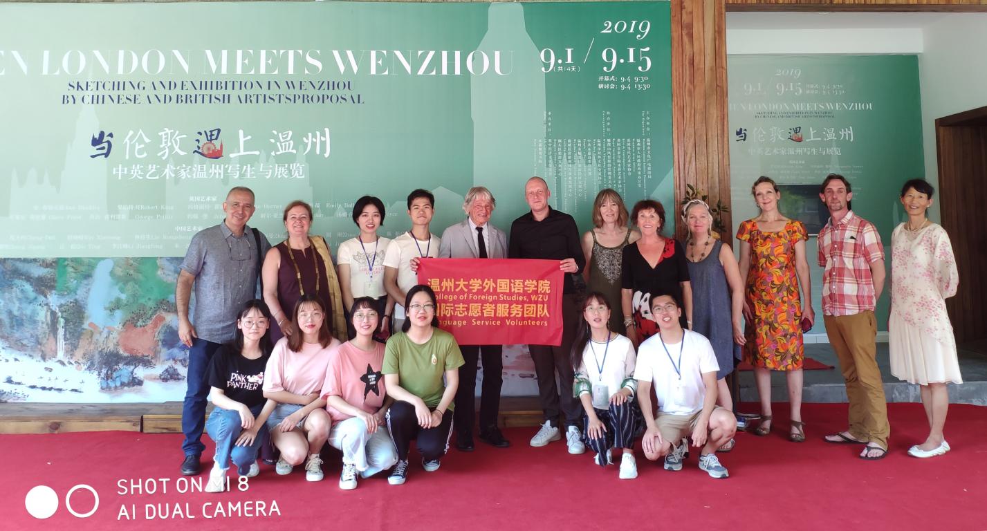 图为:翻译专业同学参加“伦敦遇上温州”中英艺术家写生交流翻译志愿者活动