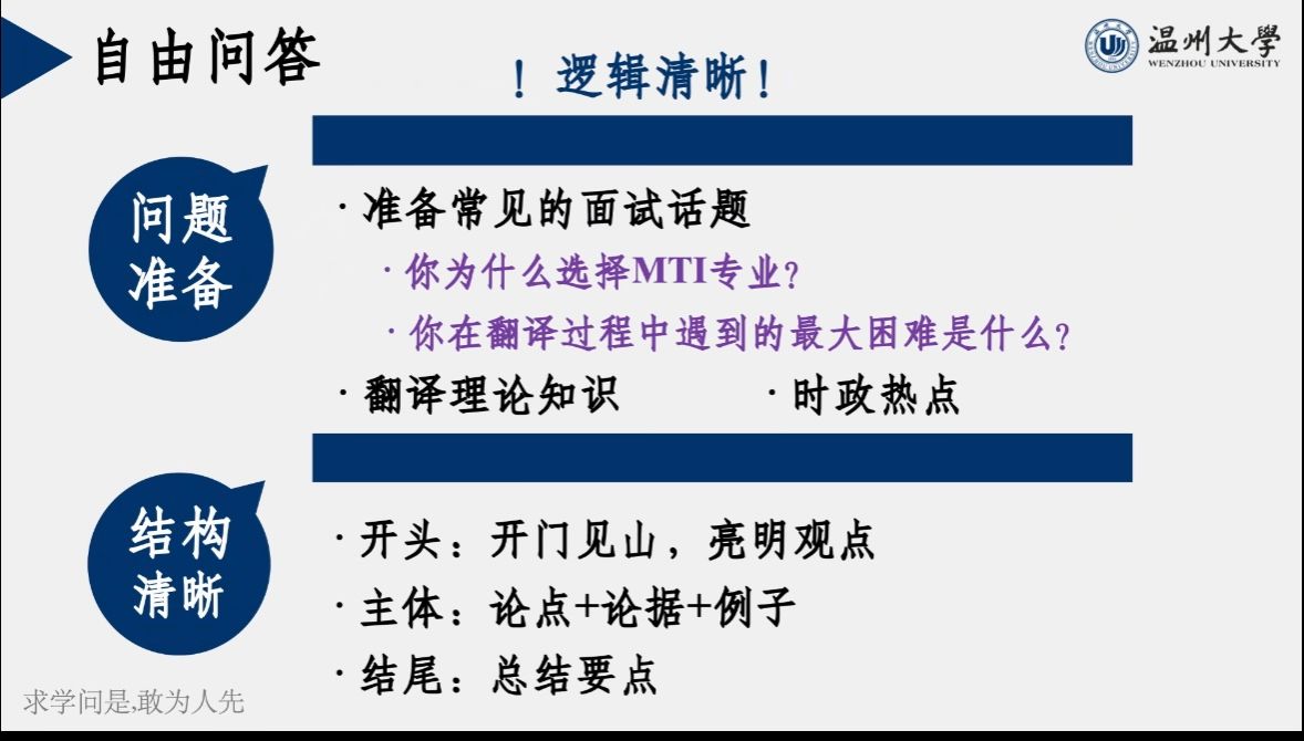 首先分享的是来自浙江师范大学的研究生翁明珠。她从复试内容、复试重点和复试过程中的注意事项三方面进行了详细分享。她指出,面试更加灵活,更考验综合能力且技巧性更强,因此建议学弟学妹们不要死记硬背,而要将精力放在重点上,尝试多提问、多思考。她还强调,在面试过程中切记不要冷场,相比内容,老师可能更关注考生的状态。此外,她还建议大家及时做心理测试,尽早安排好复试前的酒店预订、路线规划以及时间安排等生活细节。