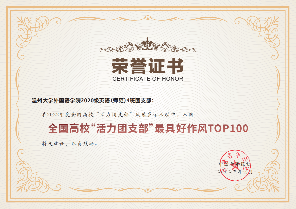 2023年4月,公司2020英语师范4班团支部入选全国高校“活力团支部”最具好作风TOP100