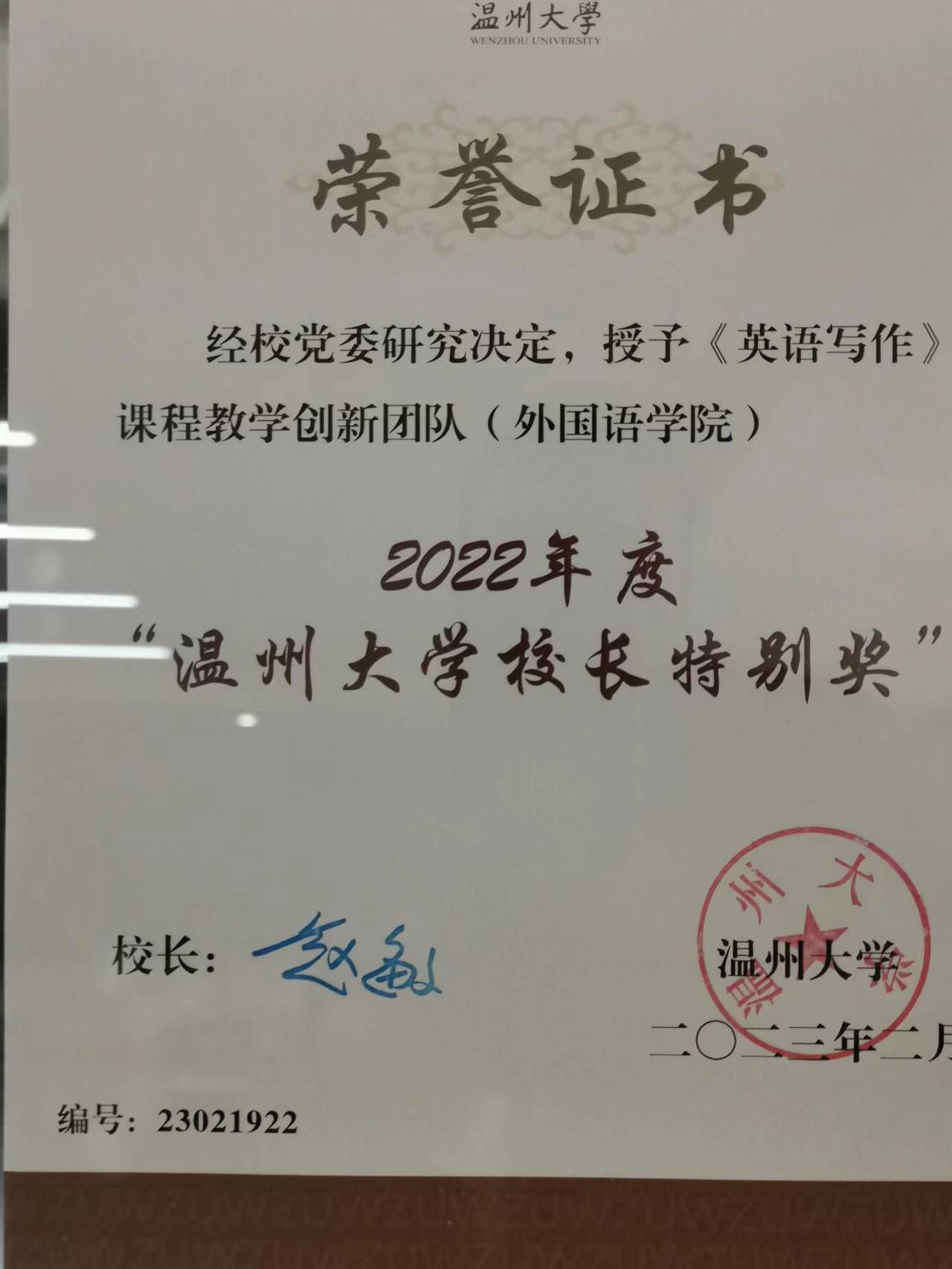 “英语写作”课程教学创新团队获评“永利65335com董事长特别奖”