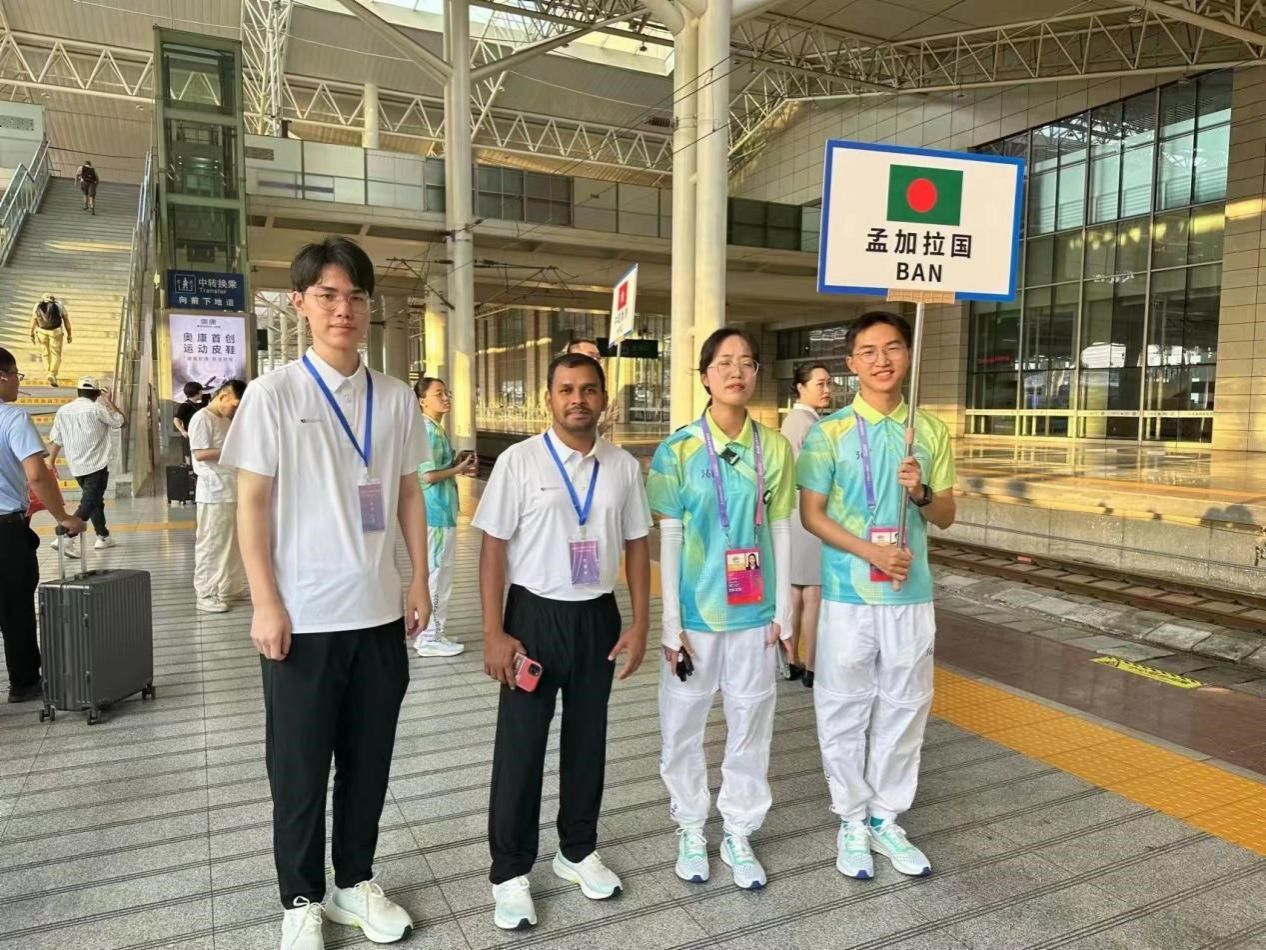 2023年9月,公司黄征黄钲老师(左一)和员工志愿者在温州南站接待孟加拉国队员