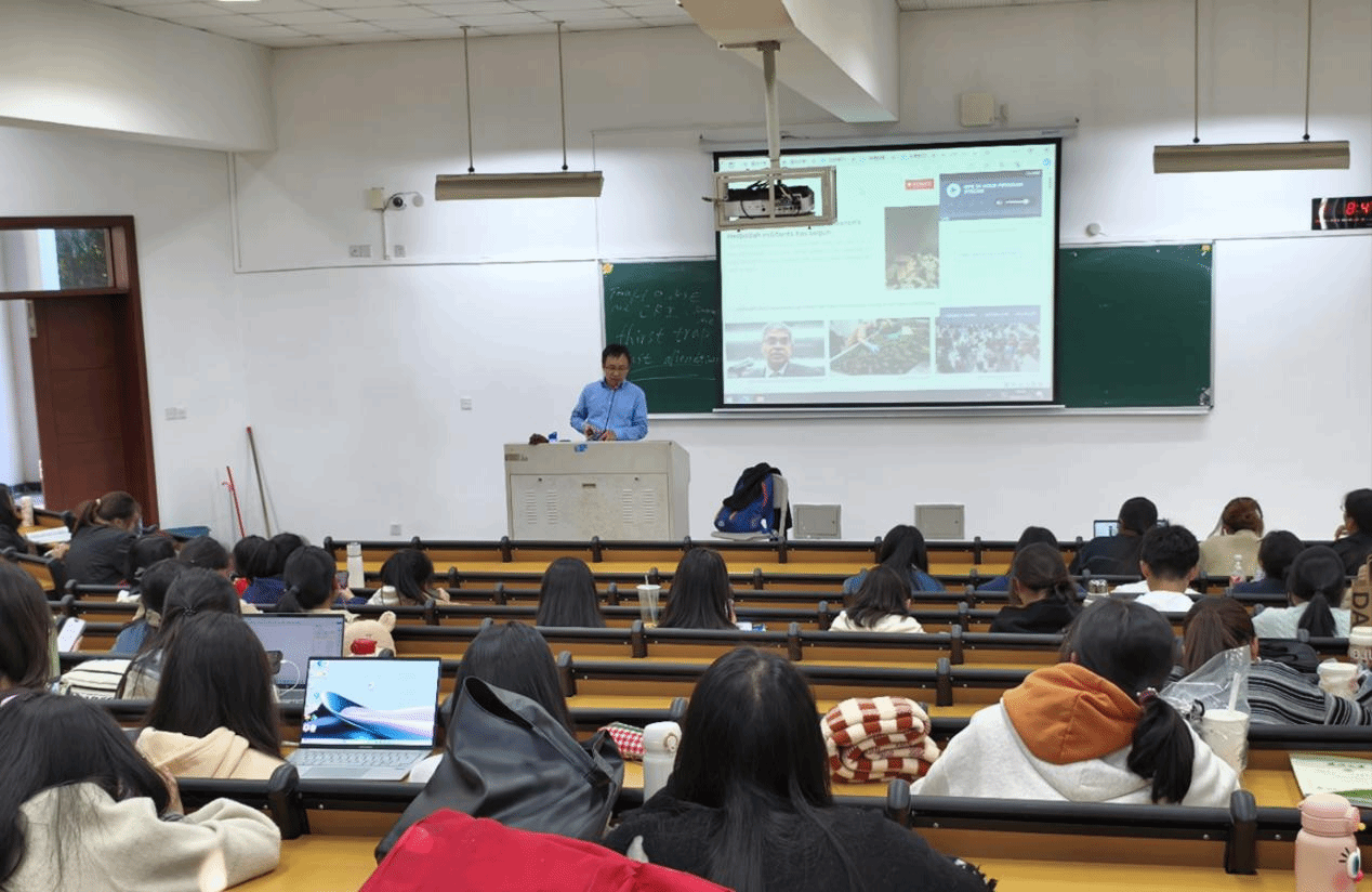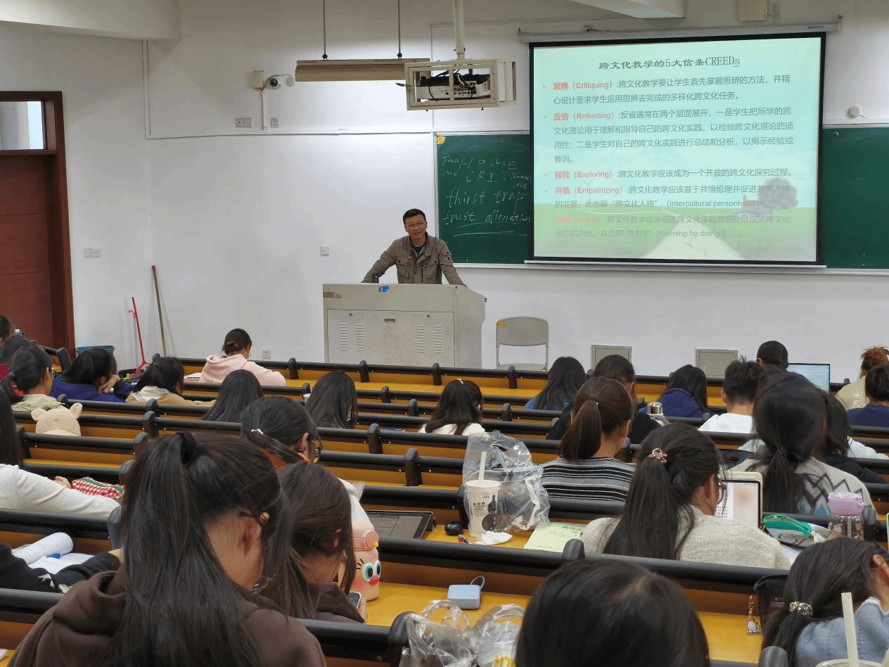首先,何永成老师在北校区一号楼101教室为大一新生开展了题为“ICT背景下英语(师范)专业员工跨文化素养提升进路再思考”的英语专业导论讲座。在讲座过程中,何老师特别提到了跨文化教学的五大信条—思辨、反省、探究、共情、体验,并辅以有趣的跨文化教学实例分析,引发了员工们对跨语言传译和跨文化热象的强烈认知兴趣。同时,他也给同学们提供了不少行之有效的英语专业学习方法,藉此鼓励大家多听多读多思考,积极了解中外文化异同,不断强化全球胜任力培养。