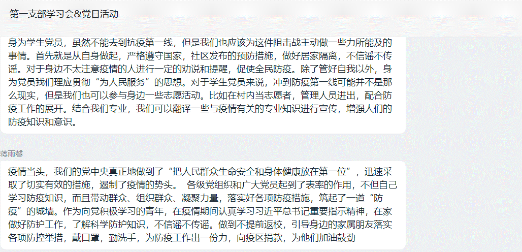 活动的第三项议程为支部抗疫事例分享。当前,全面防控新型冠状病毒感染肺炎疫情进入关键时期。党中央、国务院作出重要部署,全国上下众志成城。而面对疫情,青年志愿者从不会缺席。首先,蔡铃同志分享了外院学子的抗疫事例。入党积极分子周伶俐,洪晨瑾,丁琳琳,18英师4班同学蔡雨含,党员杨蓉同志以及杨臻宇同志,在面对这场没有硝烟的战争时,克服内心的恐惧,勇敢地投身于防疫第一线,为阻击疫情贡献自己的绵薄之力,彰显了青春的风采。