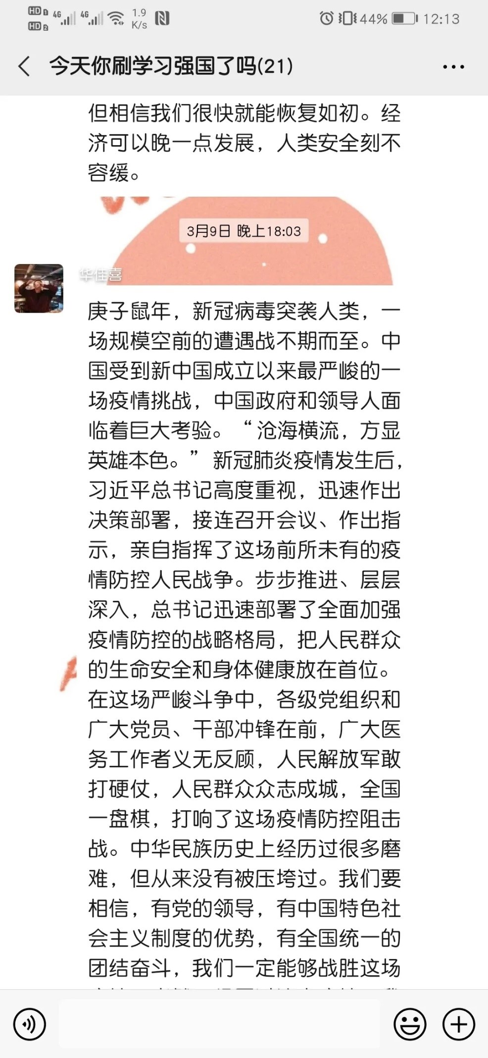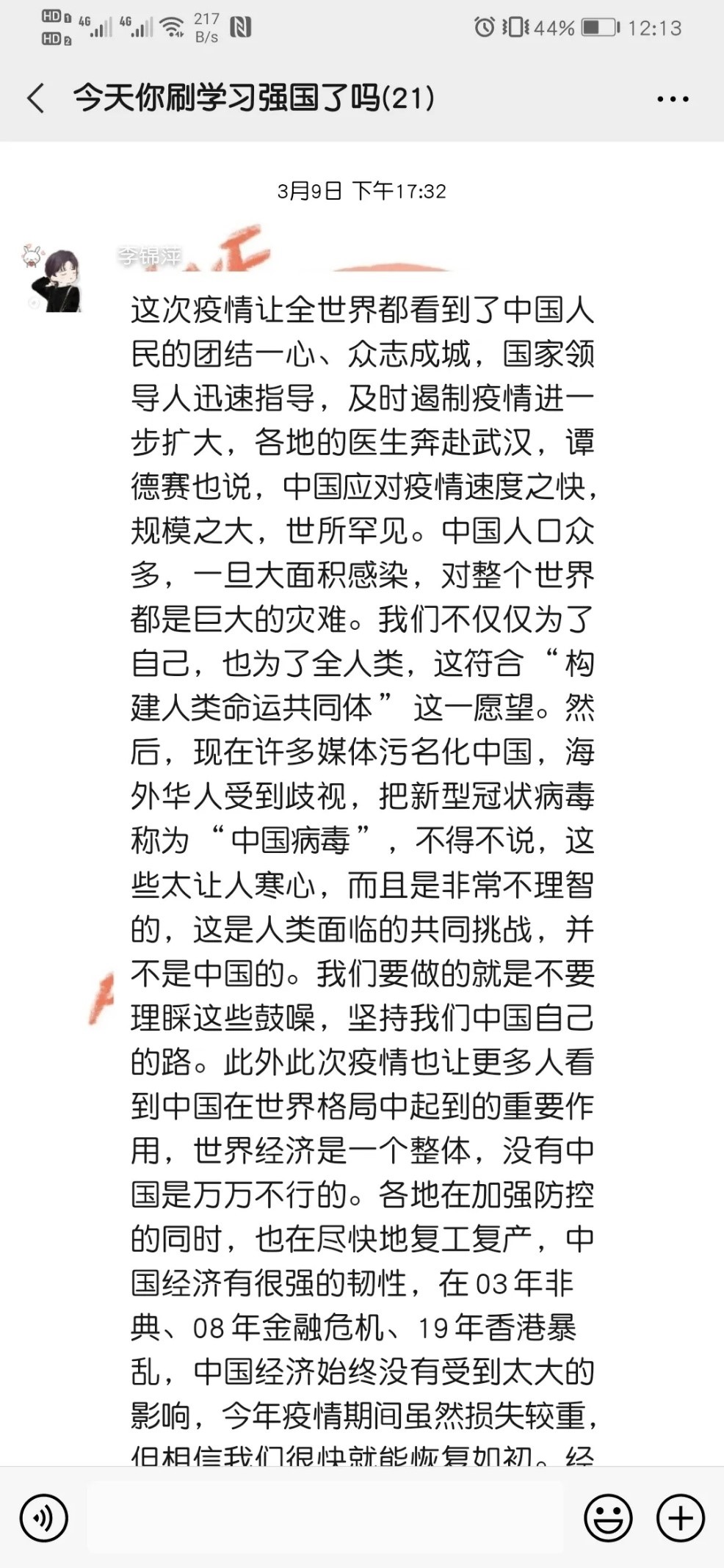 张梦欣:“士不可以不弘毅,任重而道远。”一场疫情,三代传承,我们是新时代的接棒者,接过老一辈身上的重担,现在,建设祖国的任务已经交到了我们的手上,我们中国青年更是要肩负起自己身上的责任,对自己的社会角色负责,对社会和国家负责。都说“青年兴,则国家兴”,我们更是作为新时代的青年老员工党员,更应该比普通青年有着更高的觉悟,更强的社会责任感,用自己的青春担当去建设我们伟大的祖国,努力实现中国民族的伟大复兴!