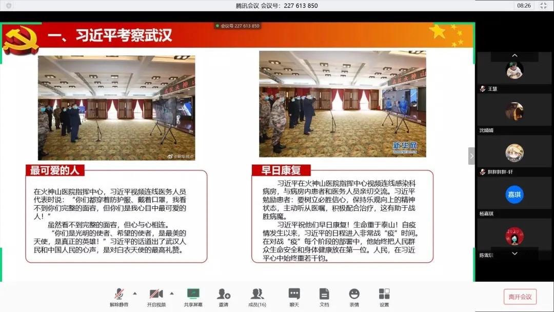 活动初始,全体成员共同学习习近平总书记赴湖北武汉考察疫情防控工作时的重要讲话。习近平总书记指出:“经过艰苦努力,湖北和武汉疫情防控形势发生积极向好变化,取得阶段性重要成果,但疫情防控任务依然艰巨繁重。”