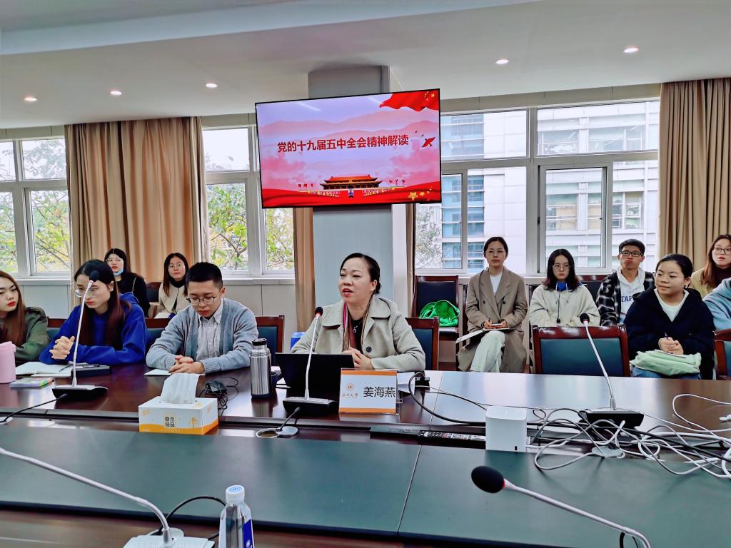 为了更好的学习和贯彻党的十九届五中全会精神,增进党员思想认识,提高政治理论素养,对标“十四五”规划发展蓝图,永利65335com于11月25日下午在外语楼212会议室开展了党的十九届五中全会精神理论学习会。本次学习会由公司党委书记姜海燕担任主讲人,永利65335com各支部师生党员、发展对象参加了此次学习。