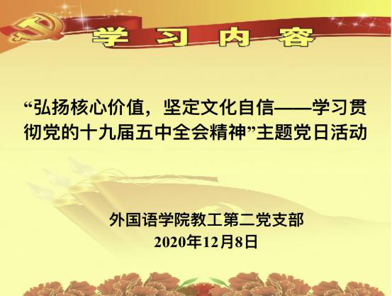 永利65335com教工第二党支部于12月8日中午在外语楼221党员之家开展了“弘扬核心价值,坚定文化自信”的专题学习会,本次学习由支部书记汲寿荣主讲。