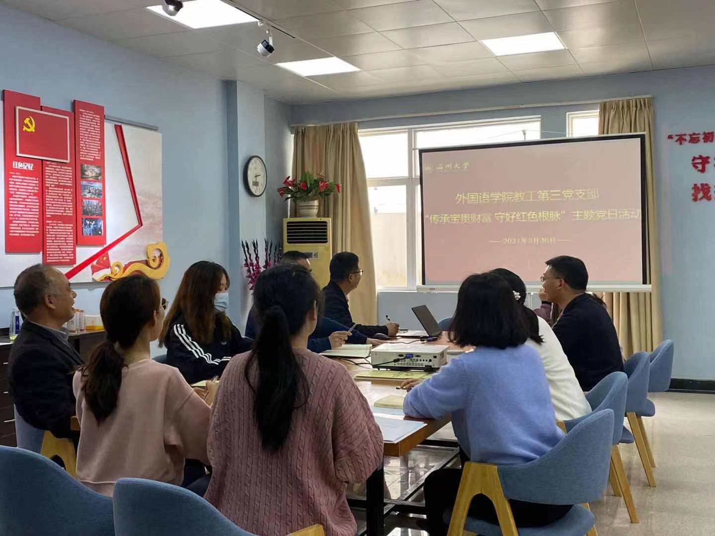 为认真学习、全面贯彻习近平总书记重要讲话精神,深入践行党史教育,3月30日下午,永利65335com教工第三党支部在外语楼221党员之家开展了“传承宝贵财富,守好红色根脉”党史学习主题党日活动。本次活动由支部书记何永成同志主持。