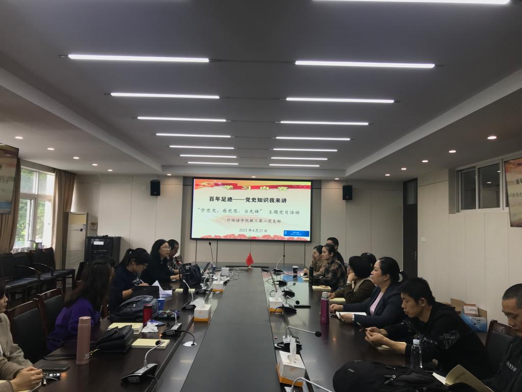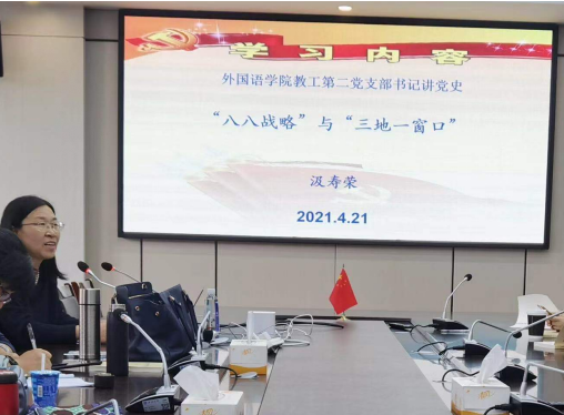 2021年,是中国共产党成立100周年,是“十四五”开局之年,也是全面建设社会主义现代化国家新征程开启之年。为了从党的百年伟大奋斗历程中汲取继续前进的智慧和力量,公司教工第二党支部于4月21日中午12:40在外语楼212会议室开展了“学党史、感党恩、当先锋”的主题党日学习活动,会议由支部书记汲寿荣老师主持,19位支部党员教师参加。