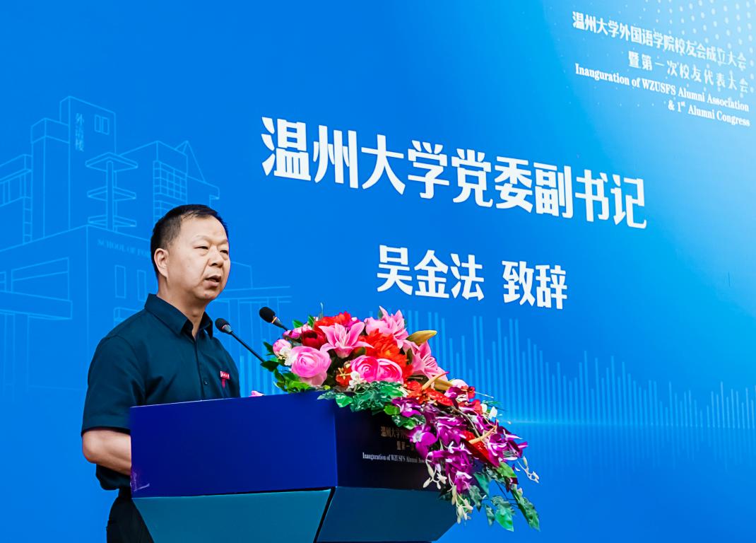 温州大公司党委副书记吴金法讲话。他对员工会的成立表示热烈祝贺,向员工回家表示热烈的欢迎。吴金法书记表示,员工是母校的靓丽名片和珍贵财富,优秀员工在各行各业发光发热,广大员工为母校的发展建言献策,提供各种力所能及的帮助,是母校发展最可信赖、最能依靠的重要力量。