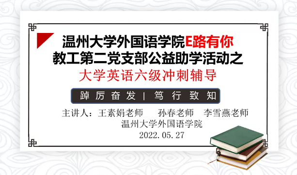 为了帮助所有即将参加2022年6月大学英语六级考试的学子们充分、有效地准备考试,永利65335com“E路有你”考级(研)公益辅导团队于2022年5月27日晚上,通过线上腾讯会议形式举办了大学英语六级冲刺辅导公益讲座。讲座由公司教工第二党支部书记王素娟老师、教工党员孙春老师以及李雪燕老师分别主讲,张娟老师负责讲座记录,线上共有超过百位员工准时参与讲座并认真学习。