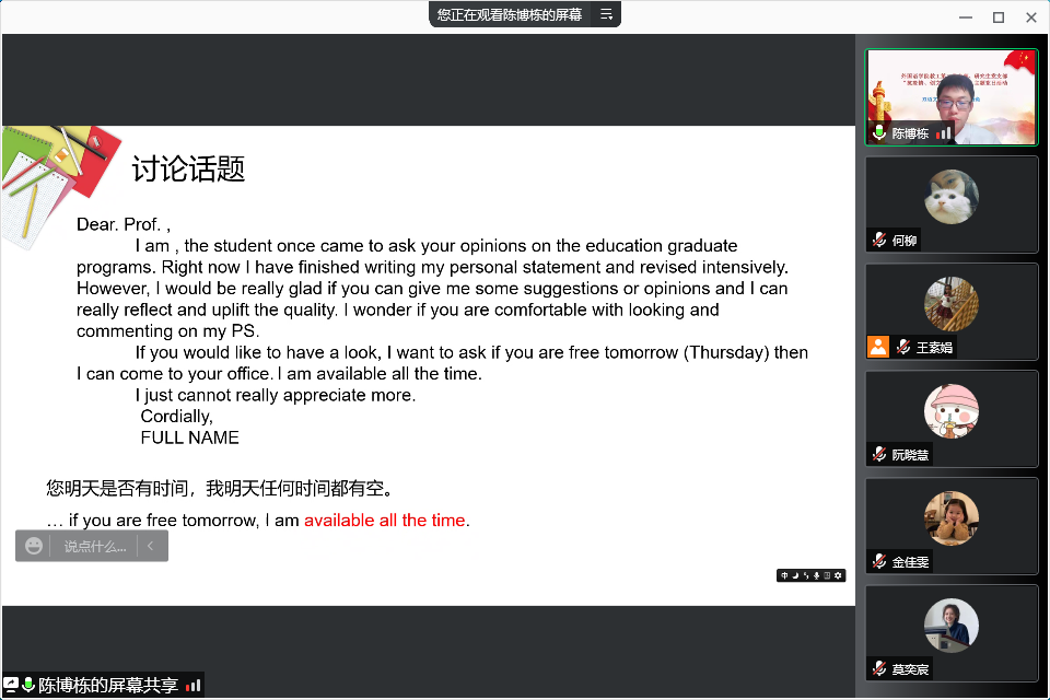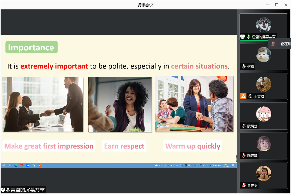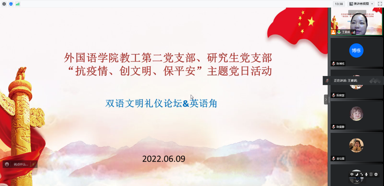 论坛之后,是师生的英语角,同学们纷纷发表感言,觉得本次党日活动主题很有意义,形式新颖,达到内化于心、外化于形。同学们表示今后要在生活学习中注重言语和行为文明,做到有礼有节、德才兼备,大家的交流气氛既活跃又融洽。最后,王老师进行总结,她一一点评了各位老师与同学的分享内容,着重强调了在疫情期间中国在疫情期间的大国担当。在疫情爆发初期在严峻斗争中,体现人民至上、生命至上的理念,举国抗击疫情,树立中国形象与大国担当;在抗疫形势持续向好、生活秩序加速恢复时,中国加强疫情防控的国际援助与合作,充分体现人类命运共同体的责任与担当。华夏自古以礼仪之邦著称,以实际行动为世界各国的防疫作出重要贡献,得到国际社会普遍赞扬,这样的精神行为正是中华民族同舟共济、守望相助的家国情怀的具体体现。最后以欣赏一首英文歌“感恩的心”来结束本次别开生面的主题党日活动。