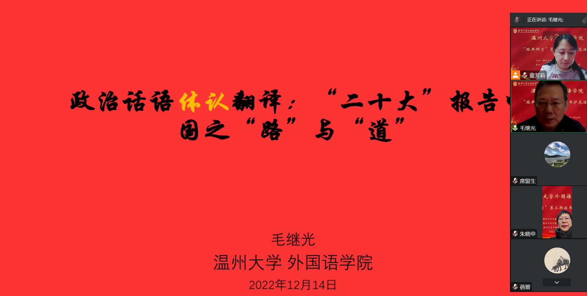 党的二十大报告指出,青年强,则国家强。当代中国青年生逢其时,施展才干的舞台无比广阔,实现梦想的前景无比光明。青年是祖国的未来、民族的希望。党的二十大报告意蕴深远,振奋了莘莘学子的心。因此,由永利65335com公司党委组织策划,外院教工第一党支部以及英文系承办的“经典研习”第三期读书沙龙活动于2022年12月14日下午在线上腾讯会议室成功举办。本次沙龙由教工第一党支部宣传委员童芳莉老师主持,支部的党员老师们以及员工党支部的党员代表们约150人参加了本次的活动。