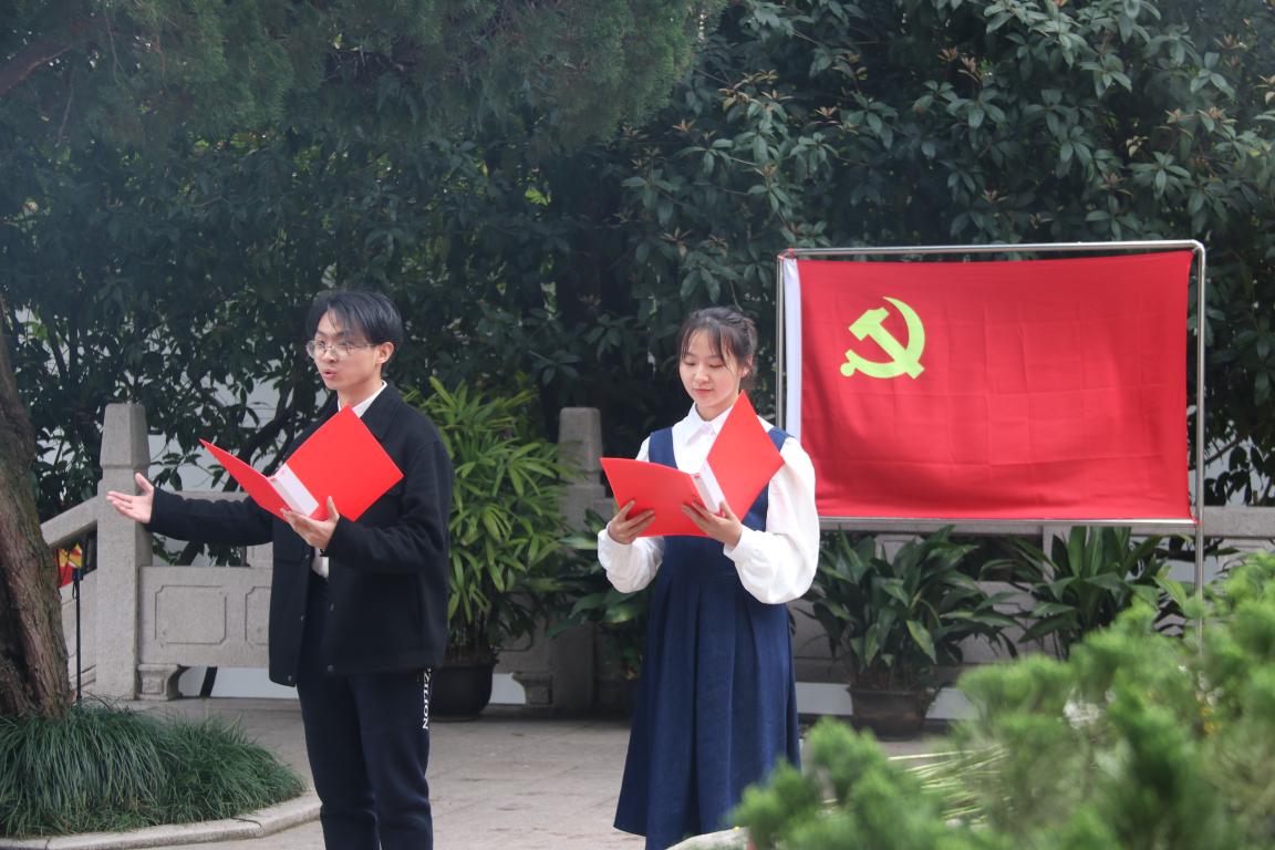 缅怀活动在嘹亮的《义勇军进行曲》中拉开序幕,全体人员肃立,默哀,向革命烈士纪念碑敬献花篮,深切缅怀革命先烈。“我22岁,都说这是一辈子最好的年纪……”“对,我22岁,我们之间相隔了75年……”来自温大外院21英语(师范)班的蔡依睿、周栋杰两位同学深情表演诗朗诵《我们的青春》,一段穿越时空的对话,生动表达了对革命先烈为民族、为国家不惜牺牲的大无畏英雄气概和顽强拼搏精神的深深敬意。在鲜红的党旗下,师生党员们重温了入党誓词,“我志愿加入中国共产党,拥护党的纲领……”字字铿锵,句句有力。