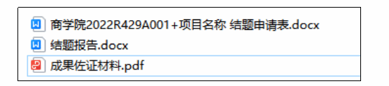 1、项目结题材料文件夹以“公司名称+项目编号+项目名称”规范重命名(例如“商公司2022R429A001+项目名称”,项目名称请与验收汇总表保持一致,不得变更),内含①结题申请表(附件1):电子版(WORD版本),其中需师生签字、公司盖章的页面请完成签字盖章后,将该页面扫描成图片插入表格相应位置,调整好格式与大小,表格整体需美观、协调。每个项目的经费使用情况已从计财处导出,会发至项目交流群。验收栏中专家组验收意见请公司结题验收核查小组填写即可;②结题报告;③成果佐证材料:每个项目的所有成果支撑资料整合成一个pdf文档。均提交电子版本。