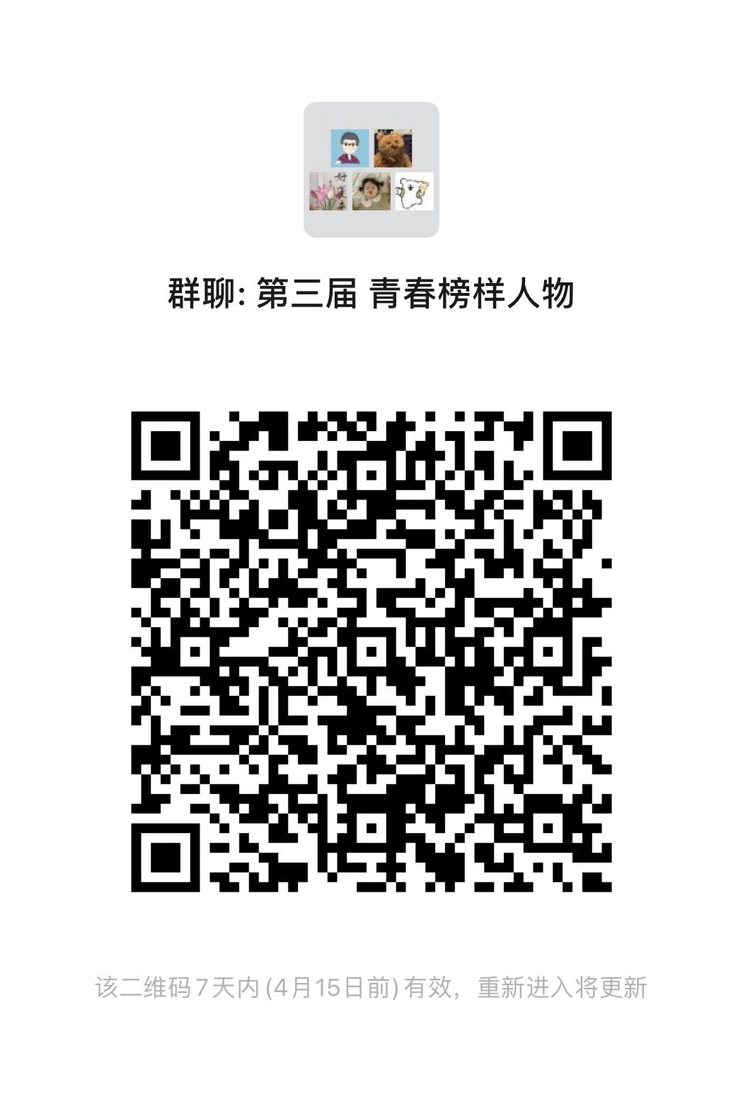 上报的材料含候选人申请表(附件1)、汇总表(附件2)和支撑材料(放在一个Word里面按照国家级、省级、市级、校级材料进行排序)。电子版邮件请以“姓名+青春榜样人物”命名,在2024年4月24日上午12点前发送至邮箱wyxuefeng2019@163.com,纸质版材料一式一份送至外语楼205办公室赵老师处。(有意申请者请于4月15日前扫码进群,后续将在群里通知相关事宜)