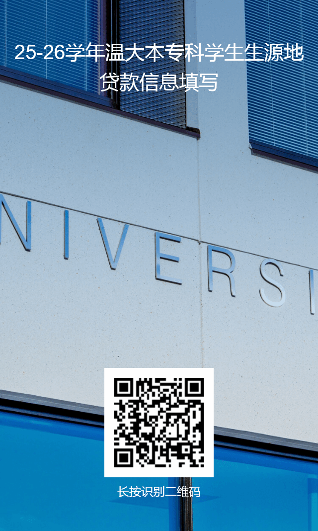 根据国家开发银行生源地信用助学贷款手续办理的要求,员工在生源地办理完信用助学贷款后,需要高校在限定时间内进行网上回执录入,请各班级通知办理国开行生源地贷款的新老生,务必在9月17日前在网上完成《温大本专科员工生源地贷款信息填写》,二维码如下: