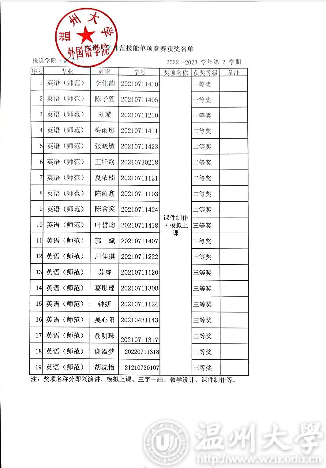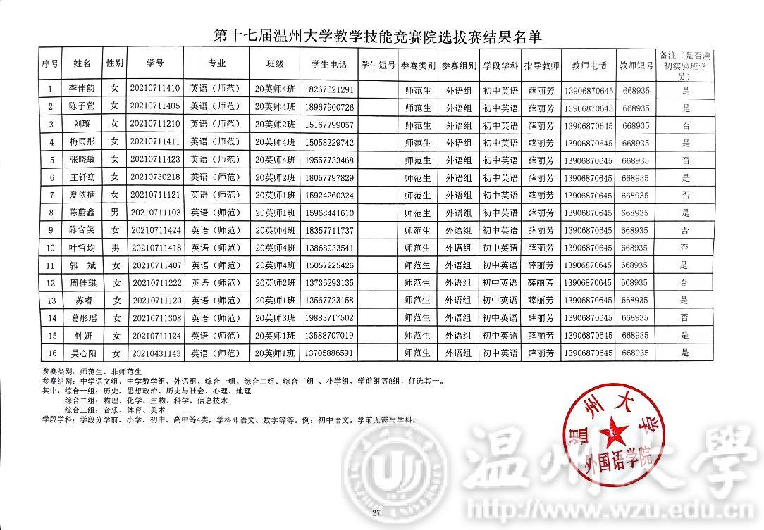 注:获得本次院赛前16名同学将入选参加永利65335com第十七届师范生教学技能竞赛校赛。校赛相关通及附件知请参考教务处网站:https://jwc.wzu.edu.cn/new2021/xdetails.jsp?urltype=news.NewsContentUrl&wbtreeid=1276&wbnewsid=19371