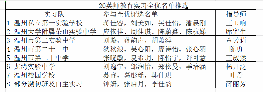 20英师共有1名同学(夏依楠)参加“田家炳杯”第九届全国师范院校师范生教学技能竞赛,4名同学(王钎窈、陈含笑、陈子萱、梅雨彤)参加浙江省高等公司第十七届师范生教学技能竞赛,按教务处规定,直接认定其为实习全优,且不占公司本次全优评选名额。另按公司规定,实习总队长(郭斌)因系竞争上岗,并对实习工作做出特殊贡献,公司藉此直接认定其为全优。此外,为使20英师教育实习全优评选公开、公平、公正,现经指导老师依据员工实习综合表现推荐,公司决定按惯例举行一次教育实习全优演讲竞赛,在以下29名同学中产生21名教育实习全优生,具体安排如下。